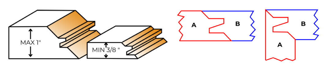 Each cutter is made for a specific wood thickness range. One router bit creates both A and B parts of the joint, so only one cutter is needed for a complete joint. Simple and effective!