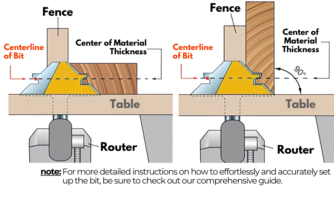 For the parts to fit together seamlessly, the bit must create a sharp mitered corner. The distance from the bit's outermost perimeter to the fence must be equal to the thickness of your stock.